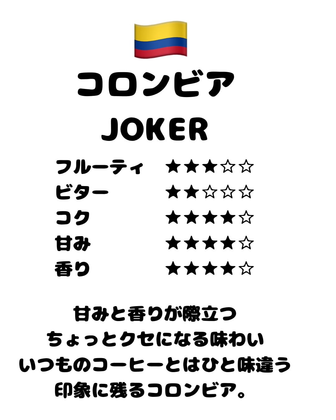 コロンビア JOKERは、力強い風味と豊かなコクが特徴の特選コーヒーです。