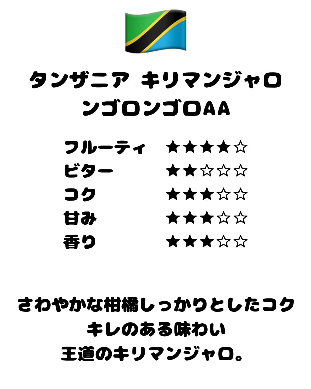 ・その他の情報や注意事項 本商品はタンザニア キリマンジャロ ンゴロンゴロAA特有のフルーティーなフレーバーと心地よい口当たりが楽しめるコーヒーで、焙煎日からの経過により風味が変わることがありますので、新鮮なうちにお楽しみください。